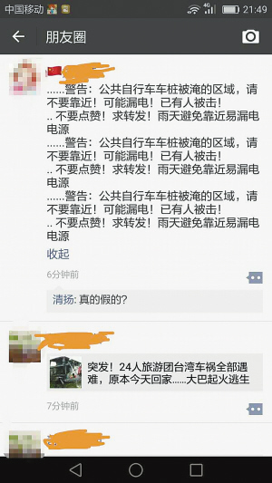 19日晚上,網(wǎng)友“清揚”發(fā)現(xiàn)朋友圈里不時有網(wǎng)友轉(zhuǎn)發(fā)一則提醒消息,這條消息看起來很貼心,但也讓人不免產(chǎn)生恐慌心理。這條消息內(nèi)容如下:“警告:公共自行車車樁被淹的區(qū)域,請不要靠近!可能漏電!已有人被擊!不要點贊,求轉(zhuǎn)發(fā)!雨天避免靠近易漏電電源?!迸笥讶D(zhuǎn)發(fā)這條內(nèi)容時,有人還配上公共自行車的圖,有的是將上面的內(nèi)容連說三遍,以引起受眾注意。